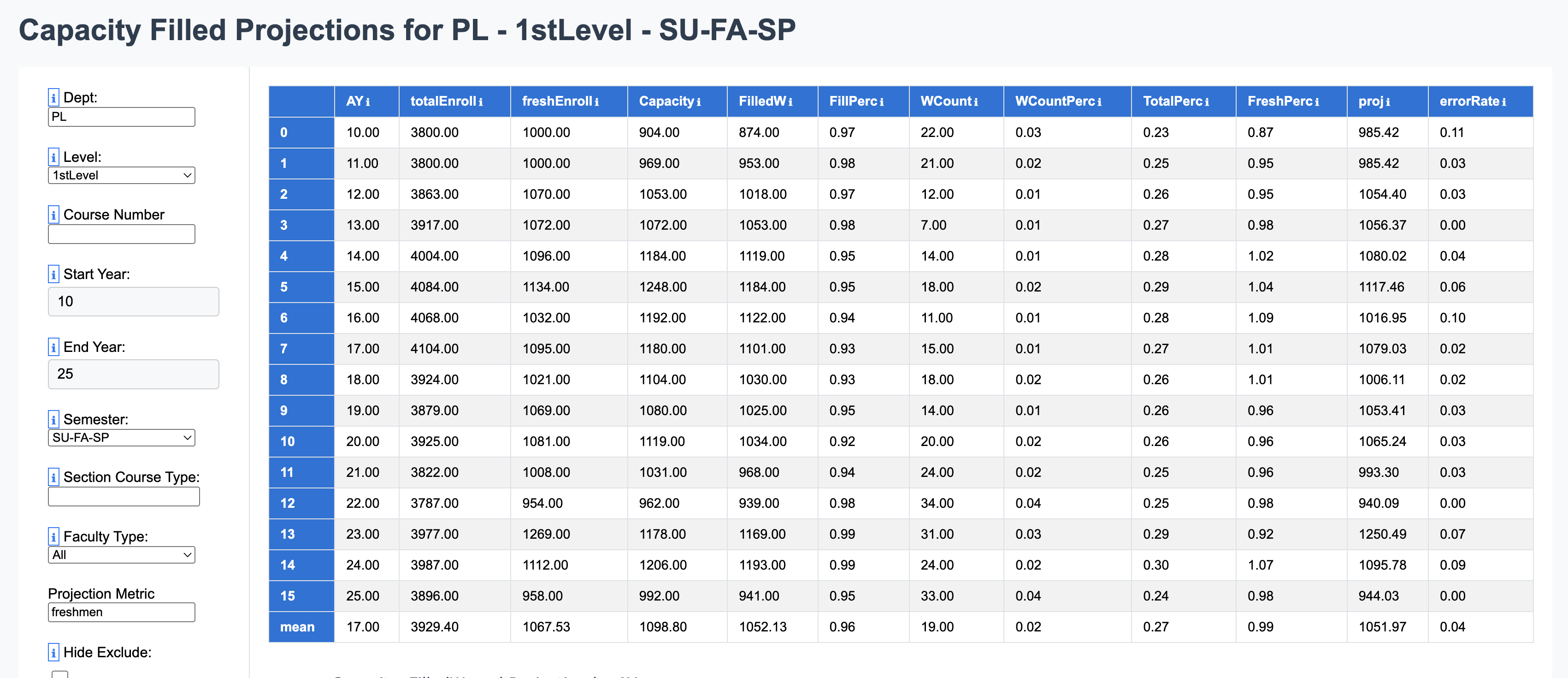 Based on either the mean TotalPerc percentage or the FreshPerc for the selected time span, this percentage is then multiplied by the population size respective to the metric used (Total Size or Freshman Size), the result is the project of how many we anticipate being filled in that AY.